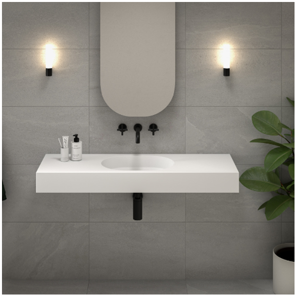 The Arki 1200 wall basin has sleek minimal lines featuring contemporary capsule-shaped bowl which makes a statement in niche spaces. Manufactured from solid surface it has a smooth matt finish that is durable and easy to maintain, ideal for residential and commercial applications.