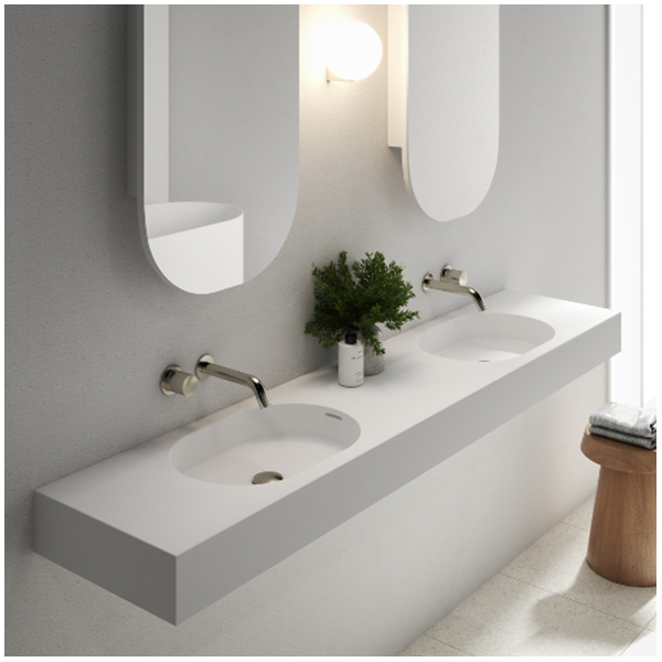 The Arki 1800 double wall basin has sleek minimal lines featuring contemporary capsule-shaped bowls which makes a statement in niche spaces. Manufactured from solid surface it has a smooth matt finish that is durable and easy to maintain, ideal for residential and commercial applications.
