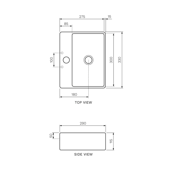 The Powder Room Bench Basin offers a compact basin perfect for areas of limited space. Featuring narrow straight walls and a flat bowl base with a centred plug and waste and single tap hole.