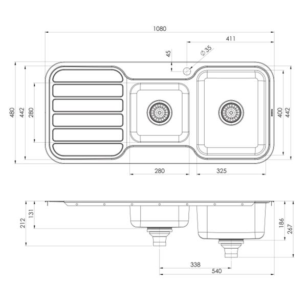 • 1080 W x 480mm L (186mm & 131mm depths)