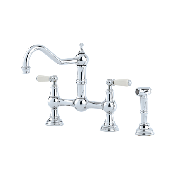 The Hambleton is a beautifully detailed classic French-style bridge mixer with porcelain handles and an up-swept spout. This charming classic tap instantly adds character and luxury to any home, as is a perfect companion for both single and double bowl fireclay sinks.
