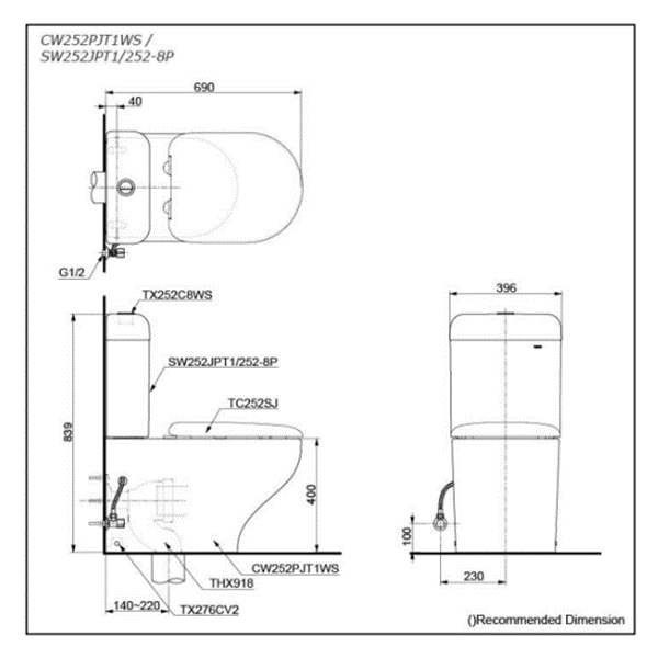 - CW252PJT1WS – D-Shape Close Couple Toilet w/ Fixing Bracket