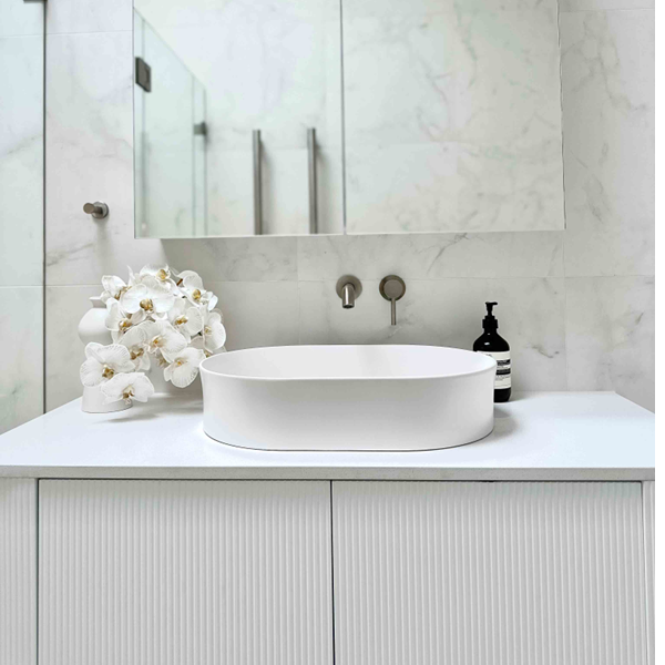 This beautiful thin-rimmed Fino basin features an organic design to suit any modern coastal bathroom. Available in Gloss White, Matte White and Matte Grey, they perfectly complement any custom vanity with stone, marble or timber top.