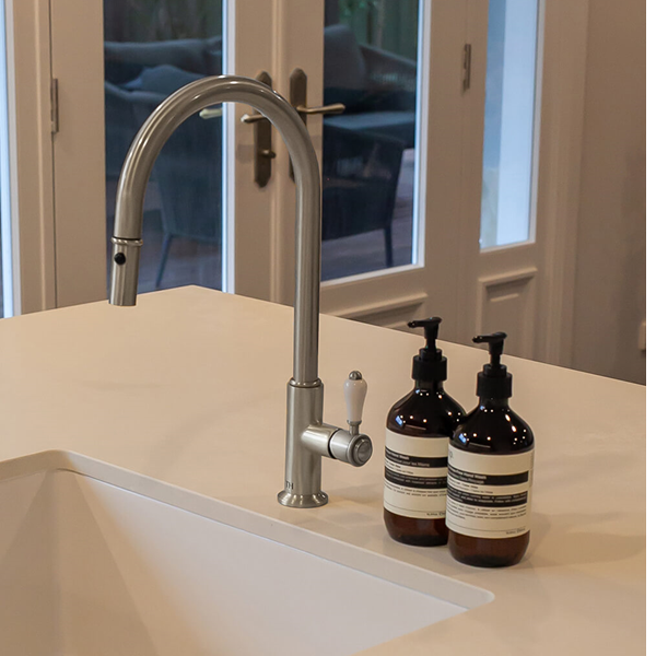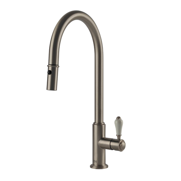 The Ludlow pull out mixer tap has been designed in England, and expertly crafted in Italy. This traditional-style tap draws inspiration from the Victorian era, offering a timeless aesthetic for your kitchen.